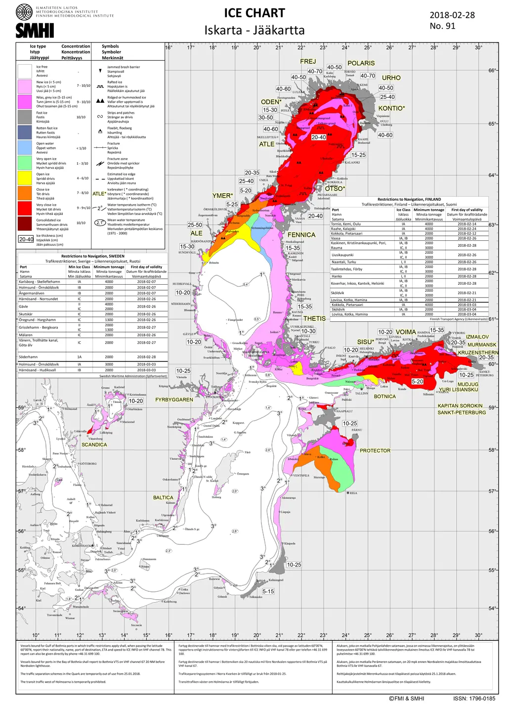 Återstoden av februari fortsatte i kylans tecken, så att vid månadens slut i princip hela havet norr om Sundsvall var täckt av is. I norra Bottenviken var isen upp till 70 cm tjock. I Östersjön låg isen i skärgården ned till Karlskrona, och nyis fanns även i skyddade vikar på västkusten. Den totala isutbredningen mer än fördubblades under februari månad.