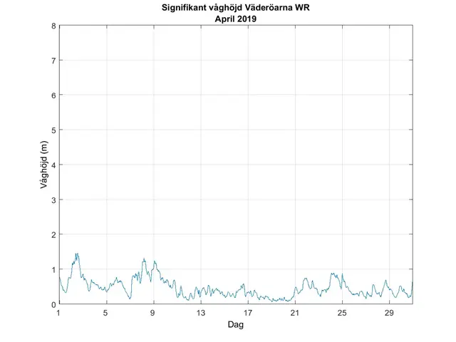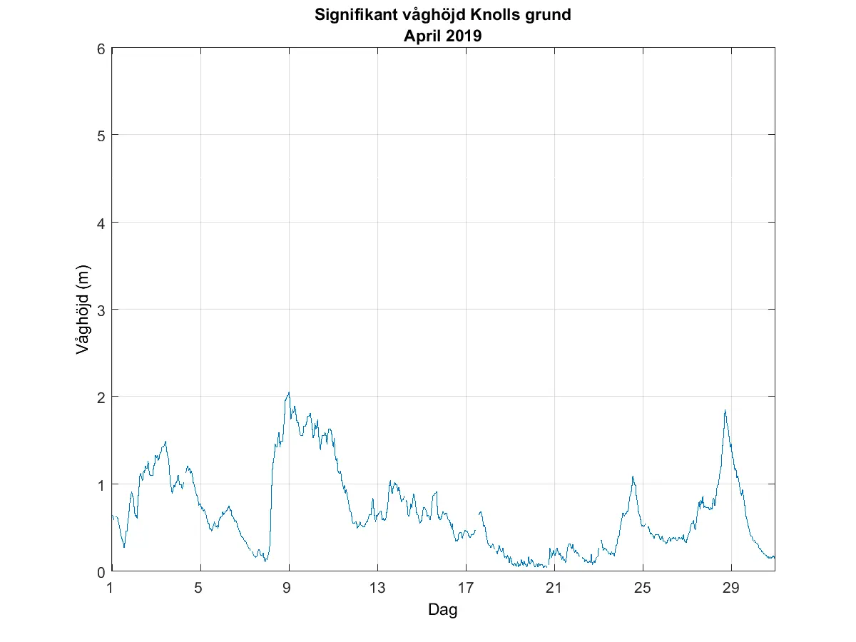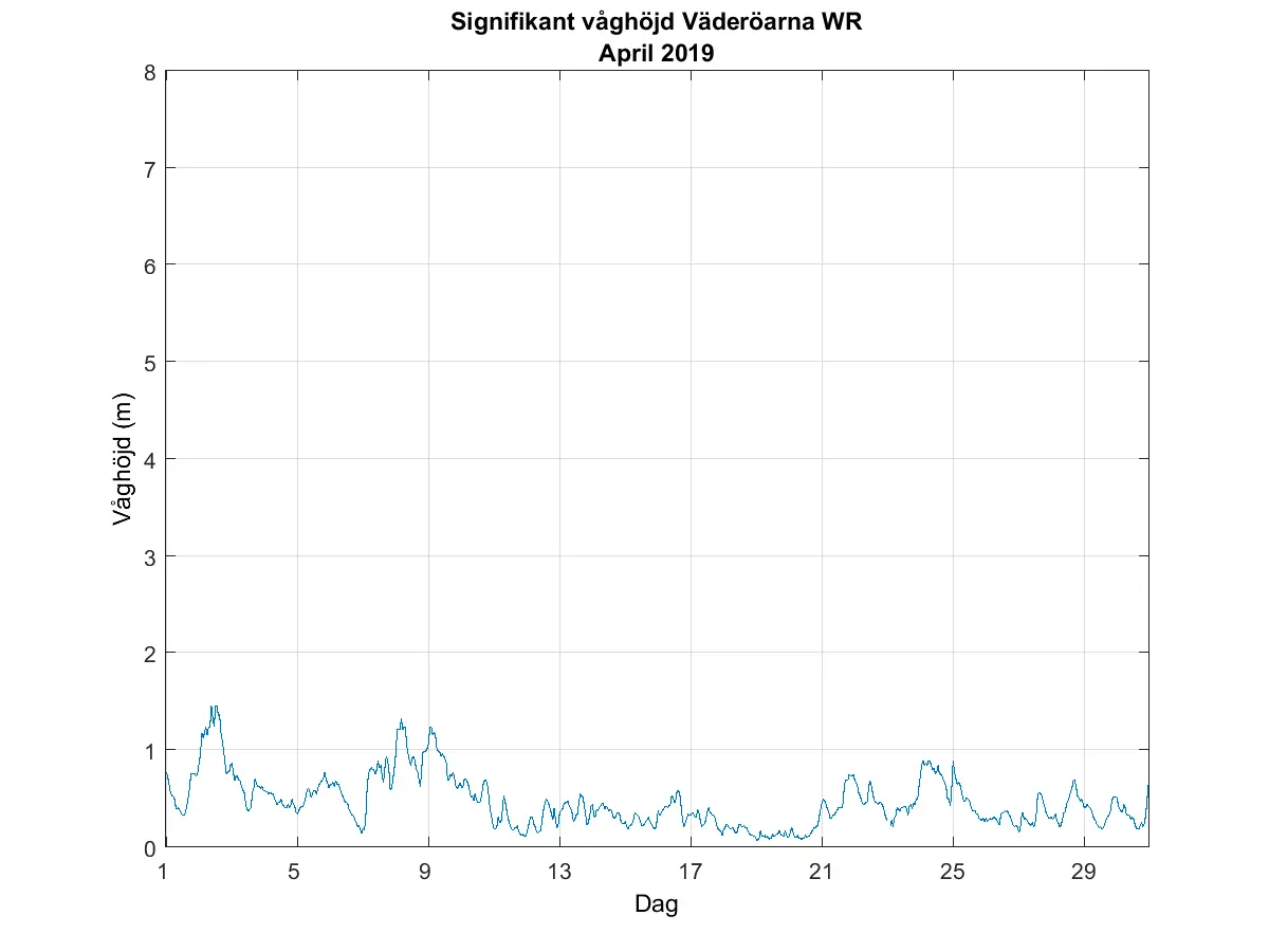 Den 2 var det en sydlig vind på västkusten och den signifikanta våghöjden* vid Väderöarna steg till 1,5 meter. Detta är den lägsta maximinoteringen för en aprilmånad på platsen sedan mätningarna startade 2005. Den tidigare lägsta maximinoteringen var från 2008 med 1,9 meter.