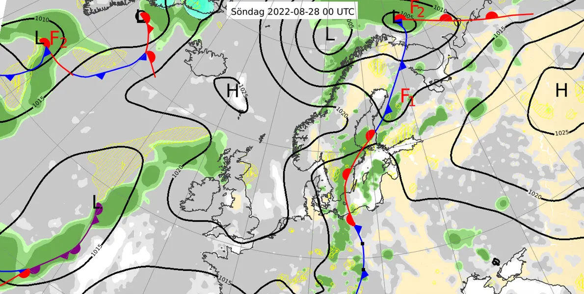 Förstora bildenAnalys av väderläget klockan 02 den 28 augusti 2022.