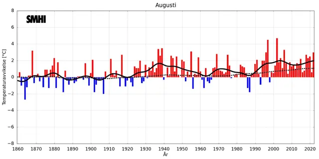 Förstora bildenStapeldiagrammet visar avvikelsen från ett referensvärde 1860-1900 för Sverigemedeltemperaturen i augusti (baserat på 35 stationer med mycket långa mätserier). Den svarta kurvan visar ett utjämnat förlopp ungefär motsvarande tio-åriga medelvärden. Linjen med prickar visar motsvarande utjämnade förlopp för den globala medeltemperaturen i augusti (data från CRU).