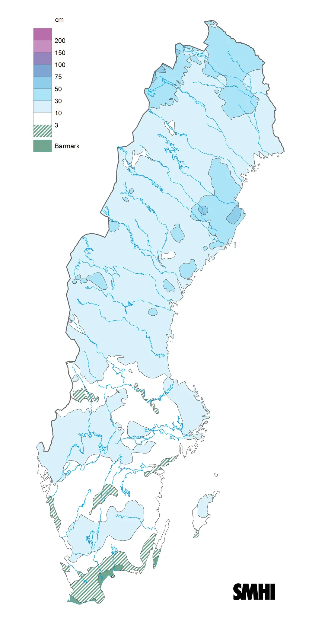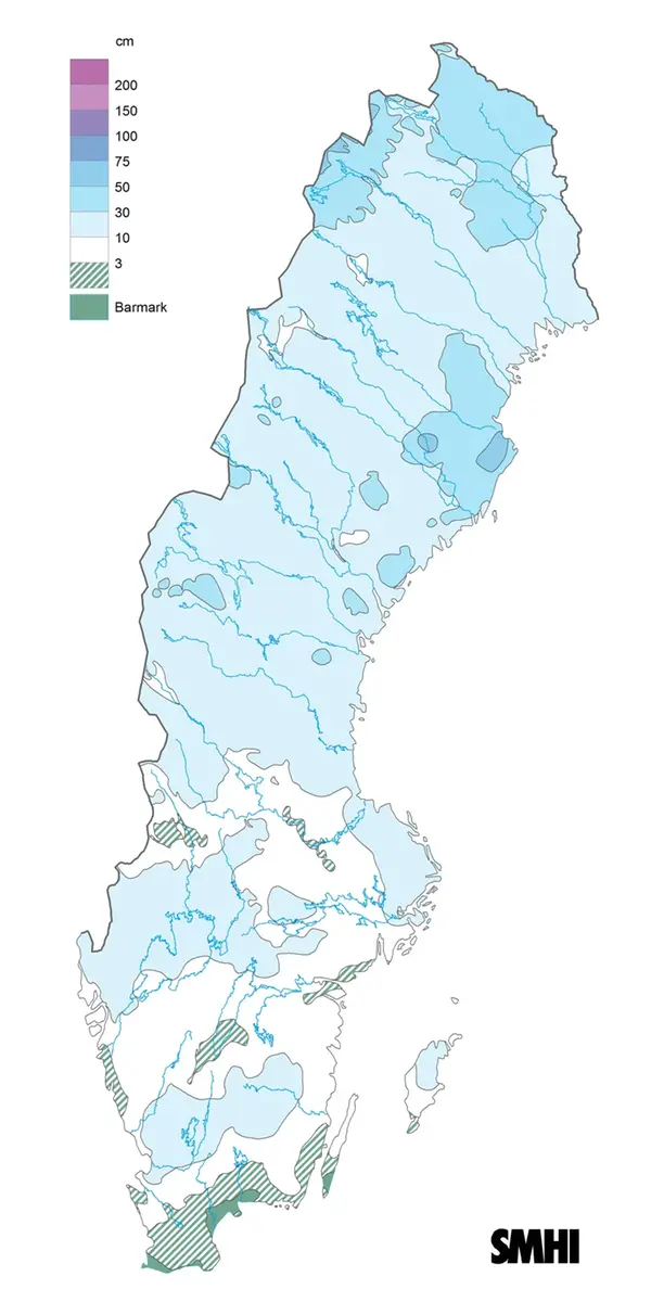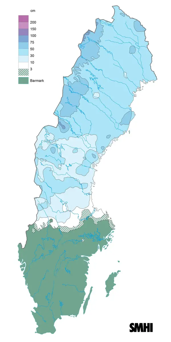Kartan visar snödjupet i centimeter (cm) på juldagens morgon 2022. Norr om Mälardalen fick man en gnistrande vit jul. Källa: SMHI.