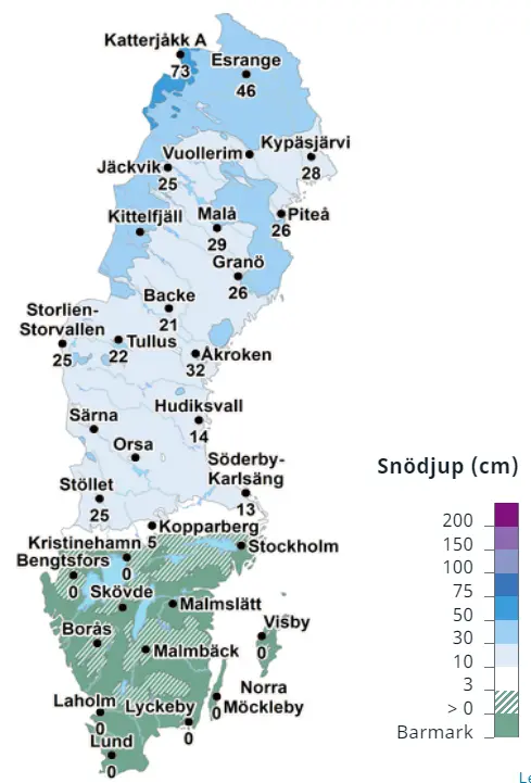Sverigekarta som visar snödjupet den 31 december 2022.Förstora bilden