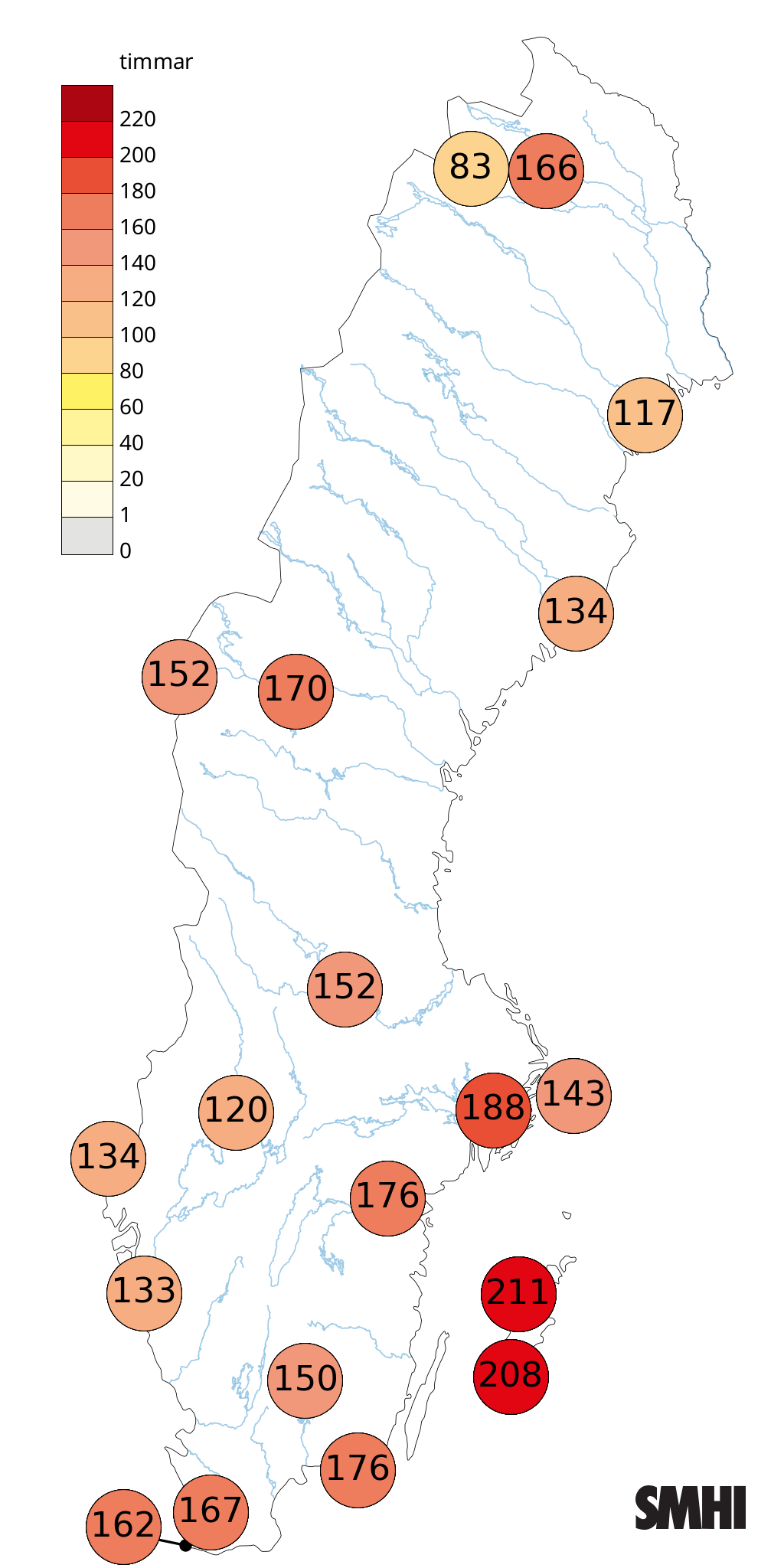 Solskenstiden blev omkring det normala eller något över det normala (jämfört med normalperioden 1991-2020) för de flesta stationer. Allra flest soltimmar blev det i Visby med 211 timmar, färst fick Tarfala med 83 timmar.