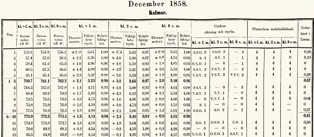 Förstora bildenData från Kalmar i december 1858 publicerade i "Meteorologiska iakttagelser i Sverige". Av observationerna framgår att Kalmar under premiärdygnet hade milt med ett par plusgrader. Vinden och molntäcket angavs i en 4-gradig skala, vilket i det här fallet betyder att det rådde frisk sydsydostlig vind och mulet väder. Nederbörden det första dygnet var 0.2 linier, vilket motsvarar ungefär 0.6 mm.