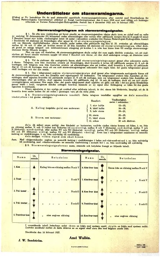 Stormvarningsstationer, till nytta för främst fisket, anordnades 1905 på västkusten från Strömstad till Skanör. 1913 beslutades att hela svenska kusten skulle innefattas i systemet och icke enbart gagna fisket utan sjöfarten i stort.