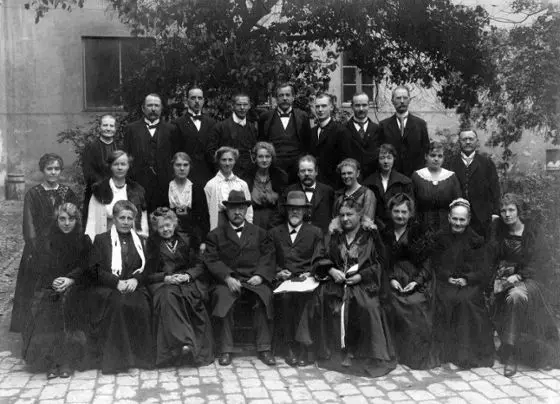 Bakre raden fr.v: Obekant, Wallin (stadsbud), Carl Höglund (vaktmästare), Bruno Rolf (förste statsmeteorolog), J. W. Sandström (byrådirektör), Oscar Edlund (meteorolog), Calwagen (meteorolog), K. Halldin (ingenjör). Mittre raden fr.v: Obekant, Eva Hamberg, Lisa Lihnroth, Siri Falkengreen, Millis Boman, Einar Petri (statsmeteorolog), Rut Nordensköld, Dagmar Hadders, Ebba Petterson, Otto Pettersson (vaktmästare). Främre raden fr.v: Runa Schwartz, Obekant, Bäckström (fröken), Svante Arrhenius (professor), Nils Ekholm (professor, föreståndare), Ekholm (fru), Ebba Bodén, Obekant, Obekant.