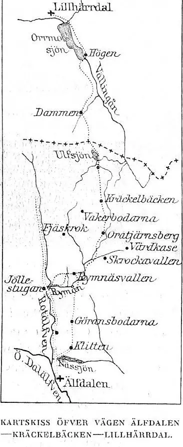 Erik Engströms kartskiss 1911 över vägen från Älvdalen till Lillhärdal över Kräckelbäcken (Engström 1914, sid 308)