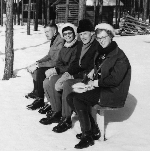 Birgitta med kollegor på tjänsteresa 1962. Från vänster Per Pålsson, Ulla Molin Dahl, Sven Fremling och Birgitta.