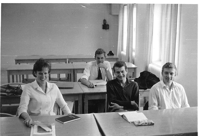 För hydrologisk tjänsteexamen 1965. Eleverna är från vänster: Gunlög Wennerberg, Lennart Hedin, Nils Sjödin och Lars-Erik Eggertsson. (Lennart och Lars-Erik hade universitetsexamen, men deltog i detta för att de inte hade hydrologi i sin examen.)