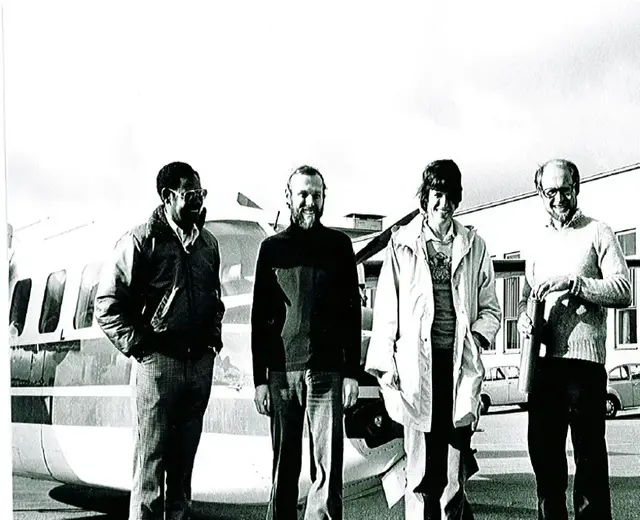 Installationsflygning med IR-scanner. Från vänster: Okänd, Per Almgren och Gunlög (SMHI), Olle Nilsson (Rymdbolaget).
