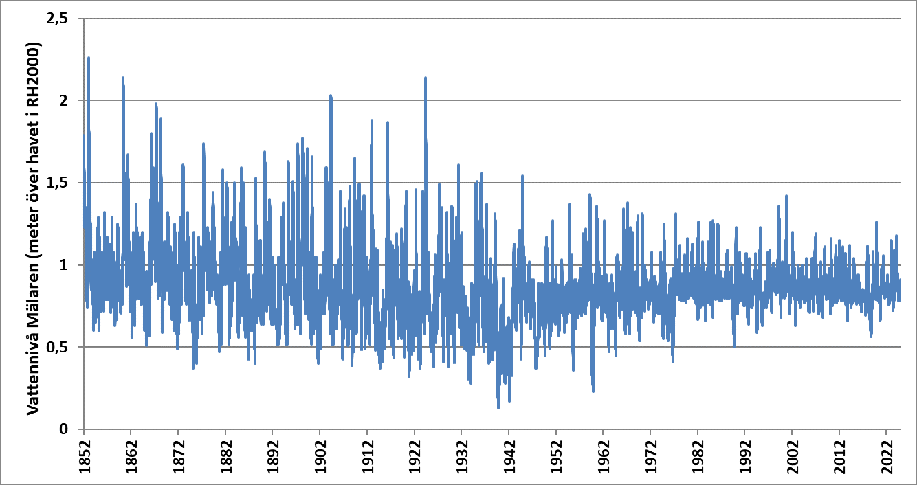 Figur 3. Vattenståndet för Mälaren (meter) för perioden 1852-2024 i höjdsystemet RH2000.