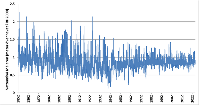 I Figur 3 visas vattenståndet för Mälaren. Det finns tidigare data från Mälaren men här visas data från 1851, efter att Nils Ericsons sluss invigts. De tidiga värdena är påverkade av landhöjningen.