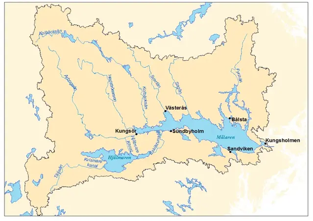 Förstora bildenFigur 2. Mälarens avrinningsområde med mätplatserna Västerås, Kungsör, Sundbyholm, Sandviken, Bålsta och Kungsholmen markerade. Från dessa punkter beräknas ett medelvattenstånd för Mälaren.