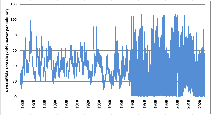 Figur 2. Vattenflöde vid Vätterns utlopp i Motala för perioden 1858-2025.