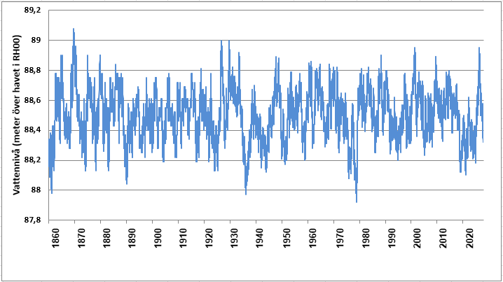 Figur 1. Vattennivån i Vättern för perioden 1858-2025 i meter över havet i höjdsystem RH1900.