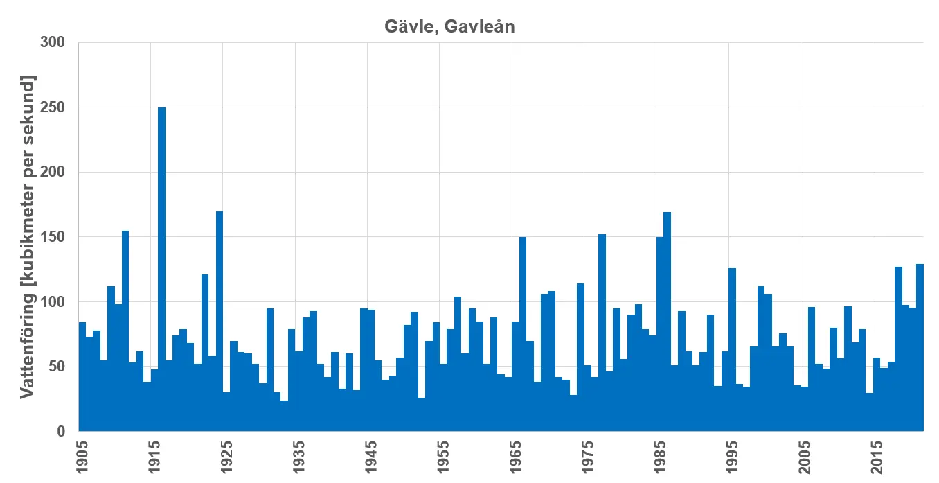 Förstora bildenÅrets högsta vattenflöde 1905-2021, Gävle, Gavleån.