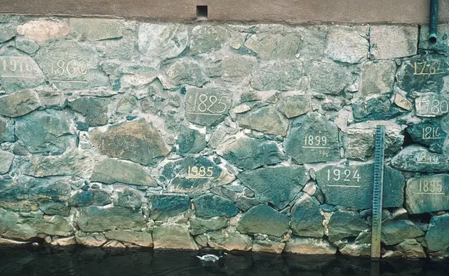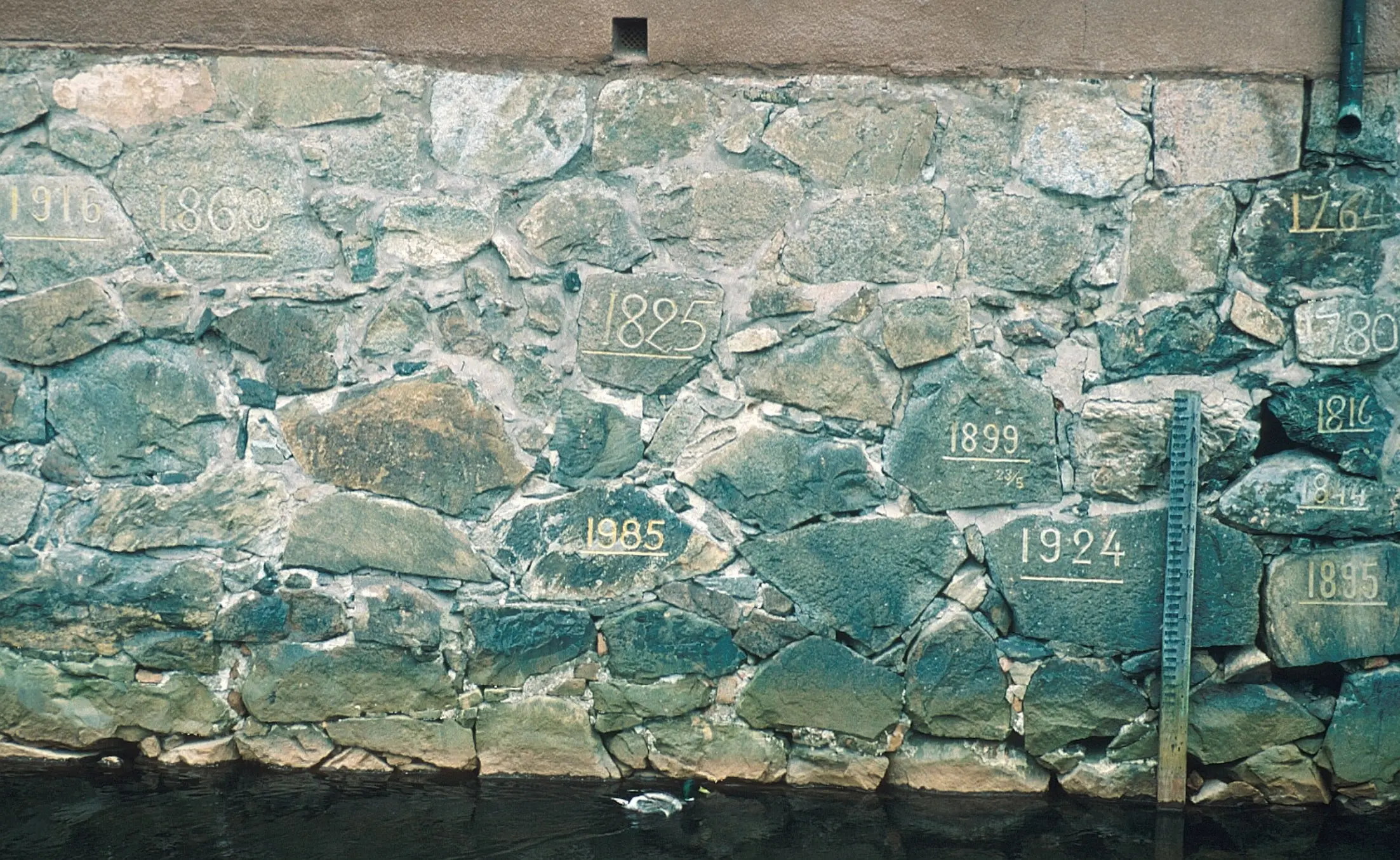 Förstora bildenVattennivåmarkeringar vid Faluån i Falun.