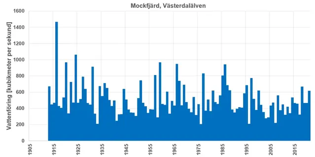 Förstora bildenÅrets högsta vattenflöde 1913-2021, Mockfjärd, Västerdalälven.