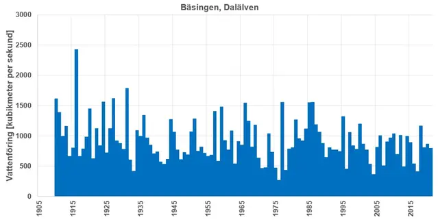 Förstora bildenÅrets högsta vattenflöde 1910-2021, Bäsingen, Dalälven.