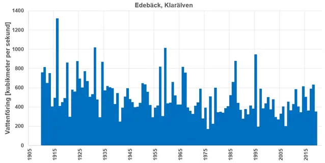 Förstora bildenÅrets högsta vattenflöde 1910-2019, Edebäck, Klarälven.