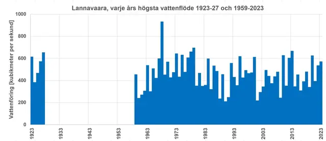 Förstora bildenVarje års högsta vattenflöden vid Lannavarra i Lainioälven, ett biflöde till Torneälven. Mätningar saknas 1927-1948.