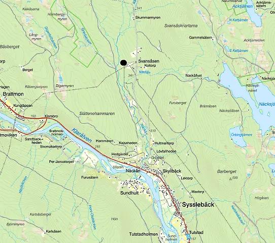 Förstora bildenKarta över Sysslebäck med Näckån som rinner in i Klarälven. Mätstationen Tåsan är markerad med en svart prick.