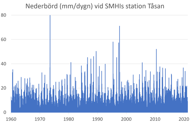 Dygnsnederbörd uppmätt vid SMHIs station Tåsan strax norr om Sysslebäck mellan 1960 och 2021. Den 20 juli 1973 föll 80 mm över området.
