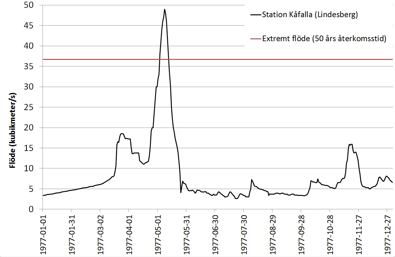 Nedan visas flöden från två stationer där flödena var höga. I stationen Kåfalla i Sverkestaån uppnåddes flöden på 49 m3/s. Det är det högsta värde som uppmätts där sedan mätningarna startade 1949 och 20% över extremflödet. Ett flöde räknas som extremt när det har en återkomsttid på 50 år eller mer. 50-års flöde för Sverkestaån vid Kåfalla 36,7 m3/s.