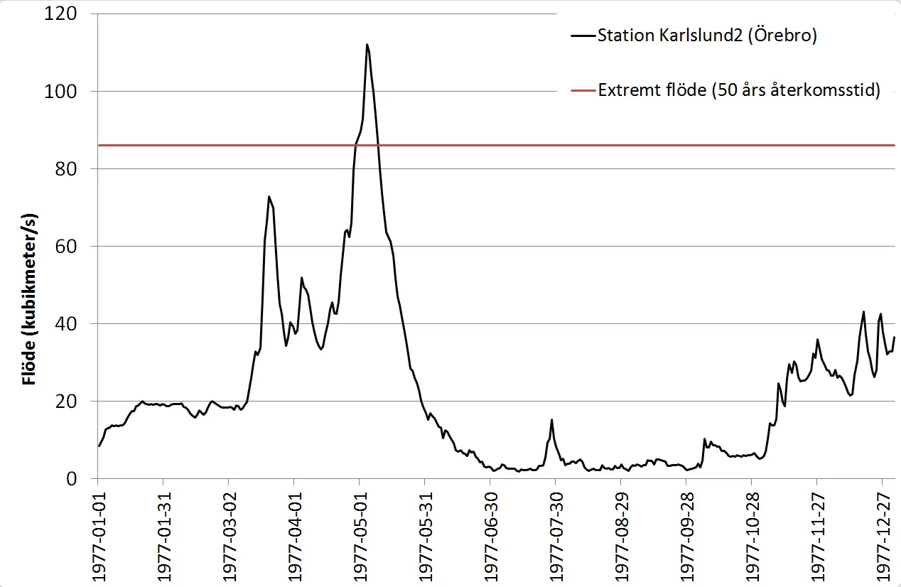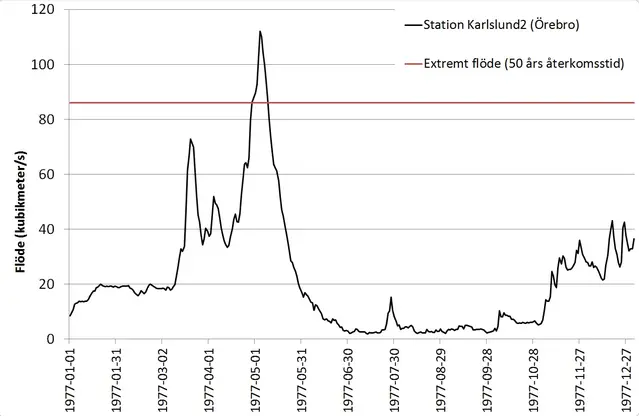 I det större vattendraget Svartån uppmättes också rekordnivåer. 112 m3/s forsade 4 maj 1977 igenom vid mätstationen Karlsund i Örebro. Även det ett extremflöde.