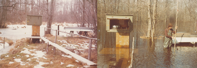 Vänster: Stationen Backa Övre under vårvintern 1977. Höger: Förste hydrologassistent Peter Ragge utför mätning vid station Backa övre 1 maj 1977.