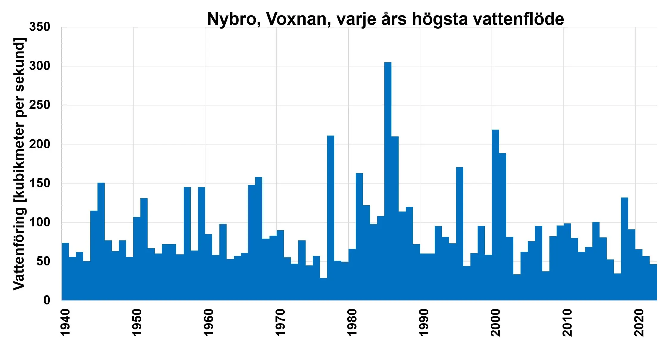Förstora bildenÅrets högsta flöde vid Nybro i Voxnan 1940-2022. Flödet 1985 är det högsta uppmätta.