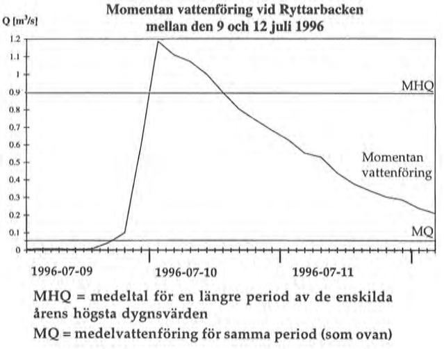 Markvattenhalten var hög för årstiden i det aktuella området. I till exempel Valdemarsvikstrakten hade det sammanlagt fallit ca 70 mm under de tre veckorna närmast före den 9, vilket är ca 70 % mer än normalt. På grund därav och att kraftiga regn förutsågs i väderprognosen inför den 9, utfärdade SMHI ett hydrologiskt meddelande, som sändes ut till länsstyrelser och SOS-Alarmering den 8. Där stod det bl a: "Vattenföringen i små och medelstora vattendrag kan därmed komma upp i nivå med det normalt högsta under året. Lokalt mycket kraftiga skurar kan orsaka mycket höga vattenföringar i de minsta vattendragen." SMHI har ett antal vattenföringsstationer i det regndrabbade området, varav stationen Ryttarbacken vid Skärkind mellan Söderköping och Linköping sänder informationen direkt till SMHI. Den ger vattenföringen från ett litet sjölöst område där flödet steg mycket snabbt och nådde sin kulmen kring midnatt natten mot den 10. Den tidigare nämnda dygnsnederbörden, ca 70 mm, ger ett flöde på 810 l/s km2 om den faller över en hårdlagd yta utan någon avdunstning och infiltration. I naturen tar dock marken och växtligheten i regel upp stora mängder vatten. Vid Ryttarbacken uppmättes därför som mest t ex 158 l/s km2 (vilket överskrider medelhögvattenföring, MHQ) och i Storåns tillflöde till Söderköpingsån ca 50 l/s km2 (på morgonen den 10).