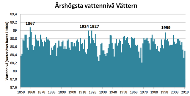 Förstora bildenVarje års högsta vattennivå i Vättern från 1858 till 2018. Mätningar från Motala.
