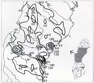 Förstora bildenMaximal 24-timmarsnederbörd 27-28 augusti 2001.