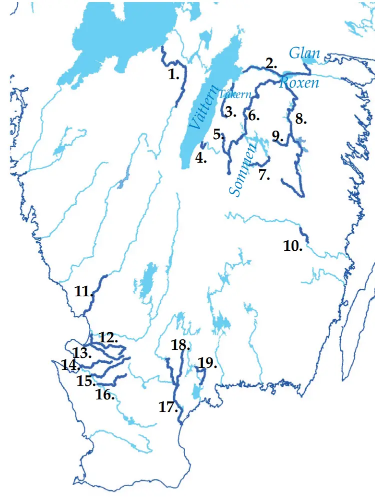 Vattenståndet i sjön Sommen och utflödet från Sommen genom Svartån var som högst i mitten av juli med de högsta värdena sedan 1924. Återkomsttiden där beräknas ha varit cirka 50 år. De nedre delarna av Svartån i Östergötland kulminerade några dagar tidigare, eftersom responsen från den lokala tillrinningen var mycket snabbare än den från Sommen och det sjörika området uppströms Sommen. Återkomsttiden för flödet i nedre Svartån beräknas ha varit cirka 20 år. Ungefär 20 års återkomsttid gäller också för flödet i Tidan vid Moholm i Västergötland. Även uppströms Sommen kulminerade Bulsjöån och Svartån samt dess biflöde Noån på mycket höga flödesvärden. Stångån uppströms sjön Åsunden och biflödet Storån beräknas ha kulminerat på cirka 5 års återkomsttid. Även de mellersta delarna av Emån steg och kulminerade på en hög flödesnivå med några års återkomsttid.