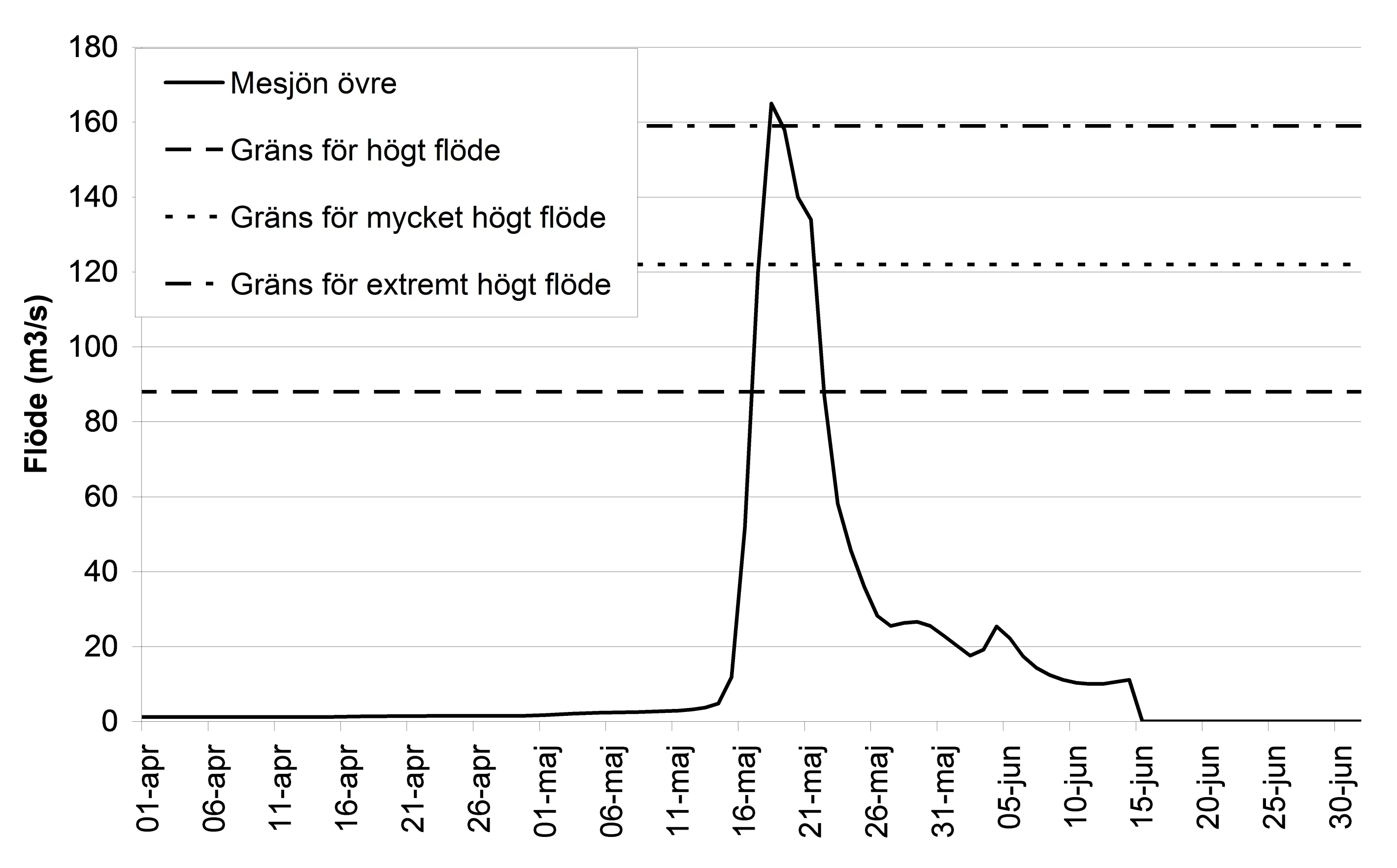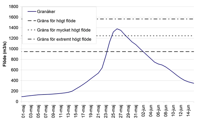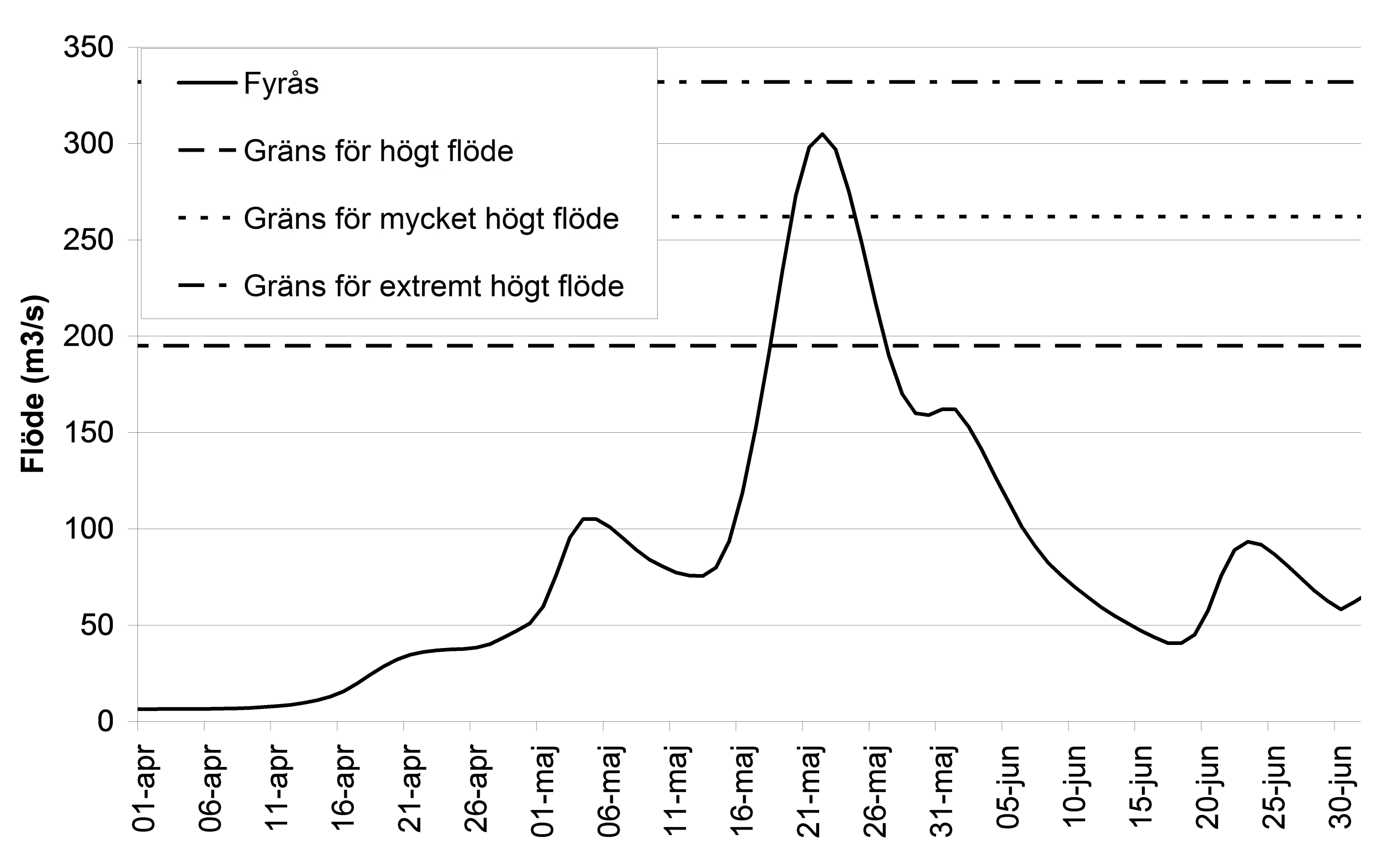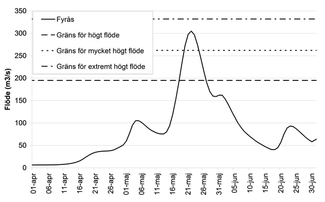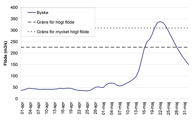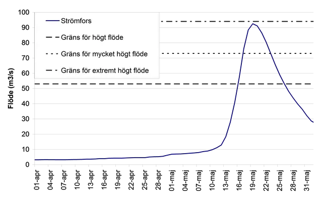 Dygnsmedelvärde av flödet i Malån, ett biflöde till Skellefteälven, vid pegeln Strömfors under snösmältningsperioden. Högt flöde innebär att flödet har en återkomsttid över två år. Mycket högt flöde innebär att flödet har en återkomsttid över tio år. Extremt högt flöde innebär att flödet har en återkomsttid över 50 år.