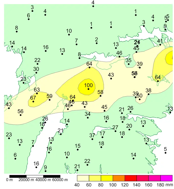 Observerad tvådygnsnederbörd 20150905 klockan 8 till 20150907 klockan 7 (svensk normaltid).