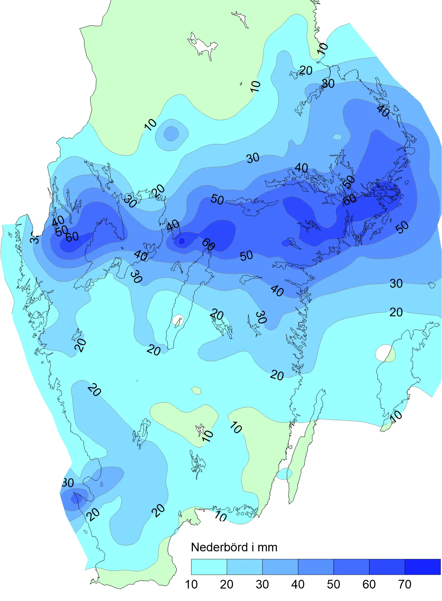 Den 25 maj kom ett intensivt regn in över delar av östra Götaland och Svealand och gav upp till 60 mm nederbörd under ett dygn. Det ledde till höga flöden i många små vattendrag.