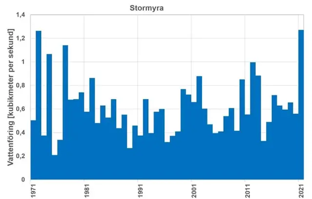 Det högsta momentant uppmätta vattenflödet per år vid Stormyra, Tyresta nationalpark.