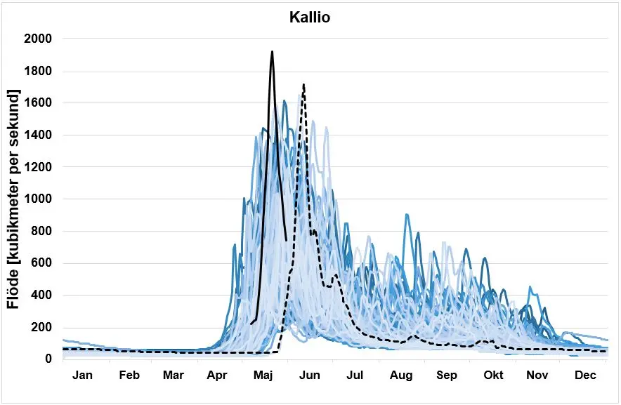 Förstora bildenVid SMHIs mätstation Kallio var flödet det högsta som observerats sedan mätningarna startade 1911. 2023 års graf visas i svart och 1968 i streckat. Fram till mitten av april finns inga värden då de ännu inte korrigerats för isdämmor.