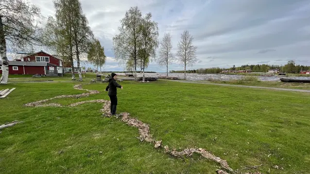 SMHIs fälthydrologer var på plats vid Kukkolaforsen den 30 maj 2023 och visar hur långt vattennivån nådde när det var som högst under översvämningarna.