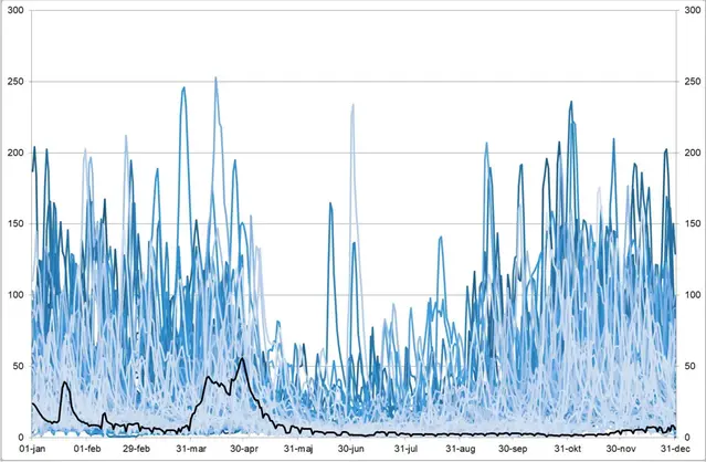 Förstora bildenVattenstånd i Siljan jämförelse åren 1900-2018. Svart linje är 1947. Den torra sommaren och hösten ledde till det lägsta uppmätta vattenståndet i sjön vintern 1947-48.