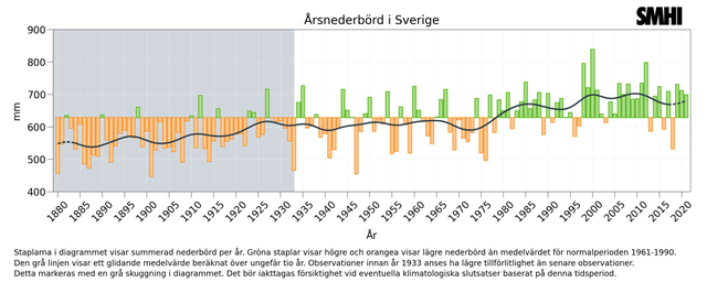 Årsmedelnederbörd i Sverige 1860 – 2018. 1947 är ett av åren med lägst årsmedelnederbörd.
