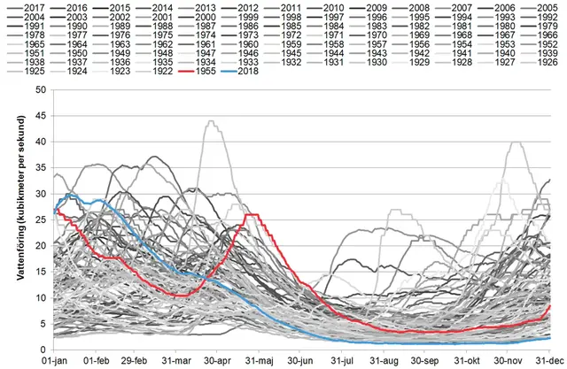 Förstora bildenVattenflöde från Möckeln i Småland 1922 till 2018. 1955 är markerad med röd linje och kan jämföras med 2018 (blå linje).