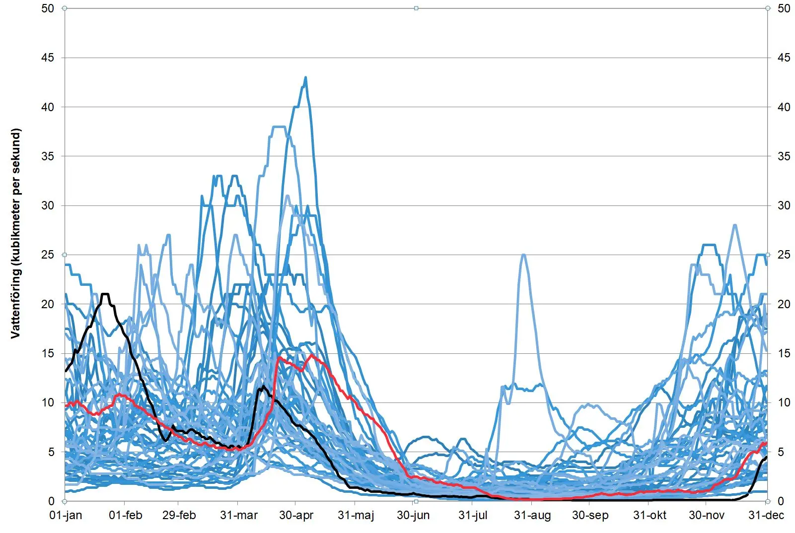 Förstora bildenVattenföring vid stationen Kättilssmåla i Lyckebyåns avrinningsområde för perioden 1939-1987. Året 1955 visas i rött och 1959 i svart.