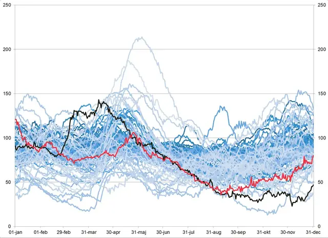 Förstora bildenVattenföring vid Mälarens utlopp för perioden 1900-2019. 1955 visas med röd färg och 1959 med svart.