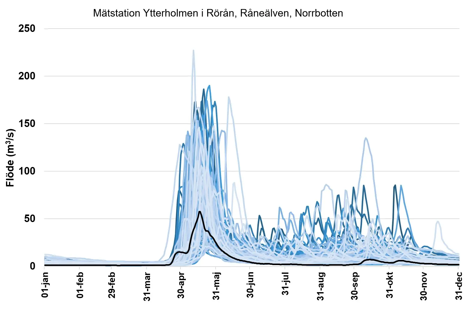 Förstora bildenFlöde vid Ytterholmen 1924-2020. År 2003 representeras av den svarta linjen.