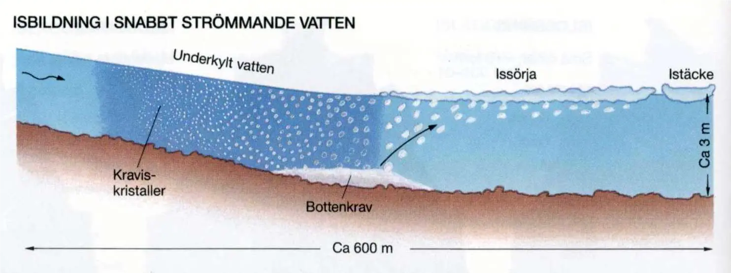 Närmast stränderna kan det bildas vanlig is, som emellanåt bryts loss och följer med strömmen. Där ytvattnet virvlar ner djupare, kan iskristaller fällas ut på bottnen och bilda bottenkrav eller bottenis.