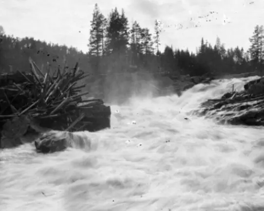 Stort virkesavlägg rakt ned i vattendragets huvudfåra. Sannolikt var detta inte en av de vanligare synerna. Foto taget vid vattenföringsmätning i Kusfors i Skellefteälven den 21 juni 1909.