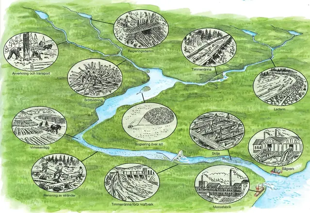 Förstora bildenIllustration över flottningens olika aktiviteter i älvens utbredning.